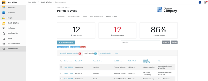Navigate to the Permit to Work page, under the Health & Safety item on the Navigation Menu, and then choose the relevant permit from the list.
